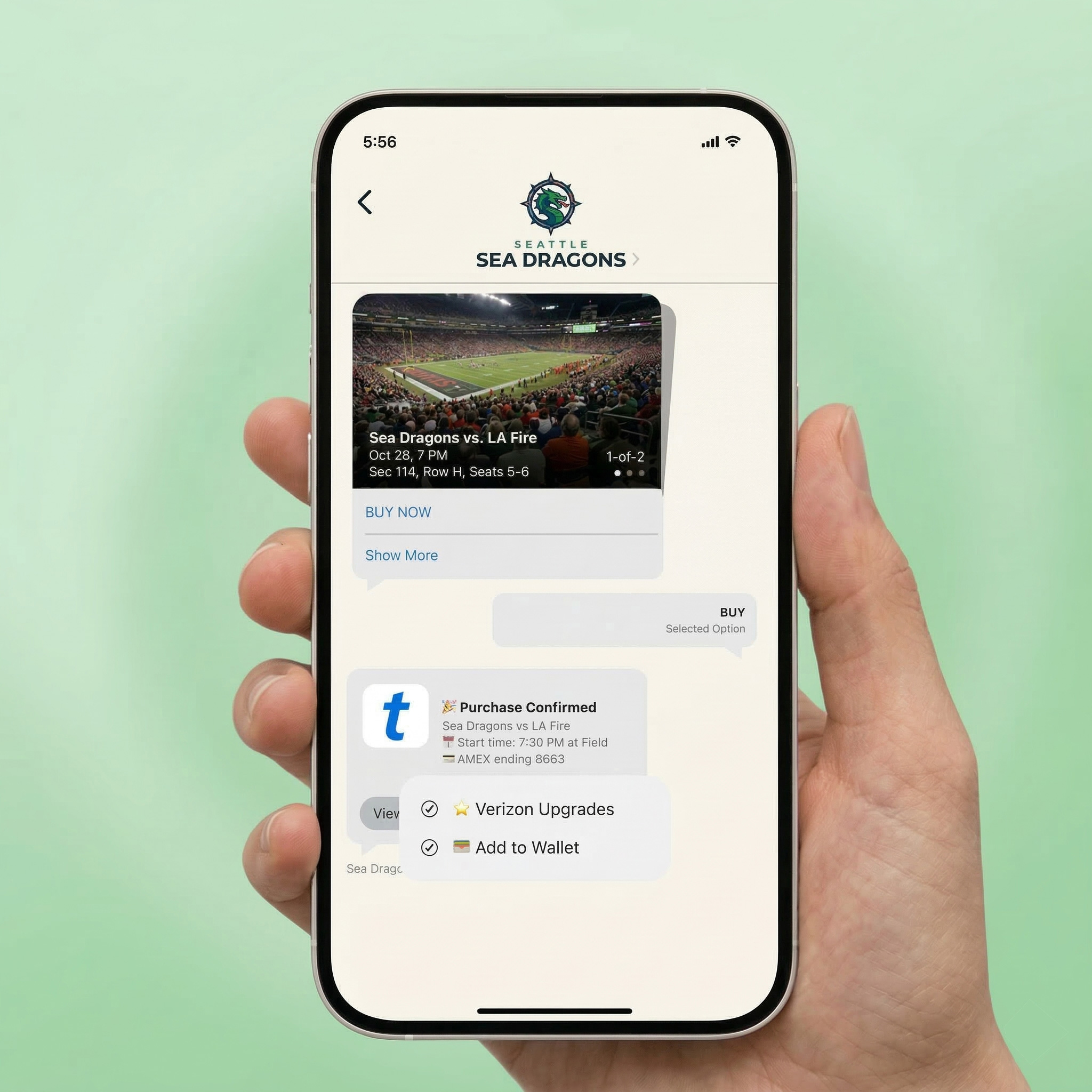 Enable instant in-message ticket purchasing. Fans can select seats and complete transactions directly within the RCS conversation, reducing friction and eliminating drop-off from external links.